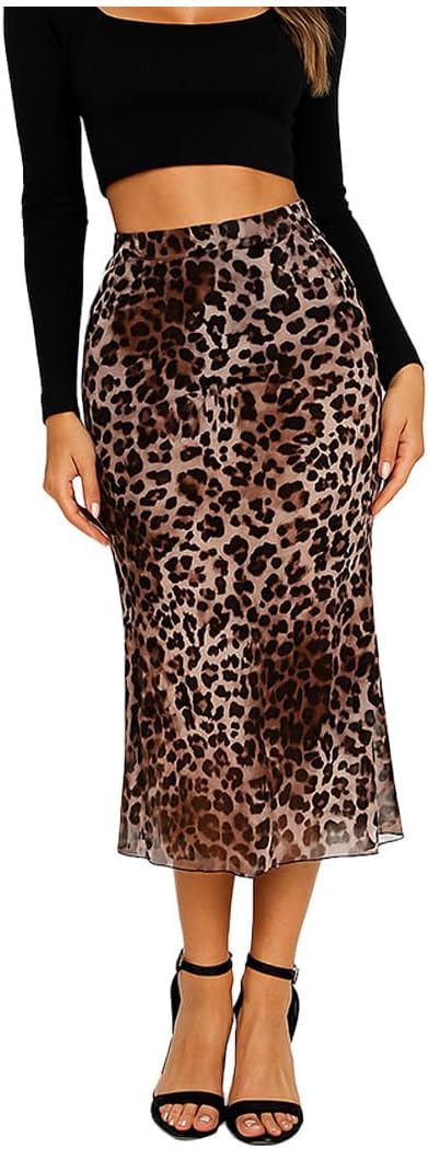 Leopard Print Mesh Midi Skirt for Women Cheetah Elastic High Waisted Bodycon Long Skirts