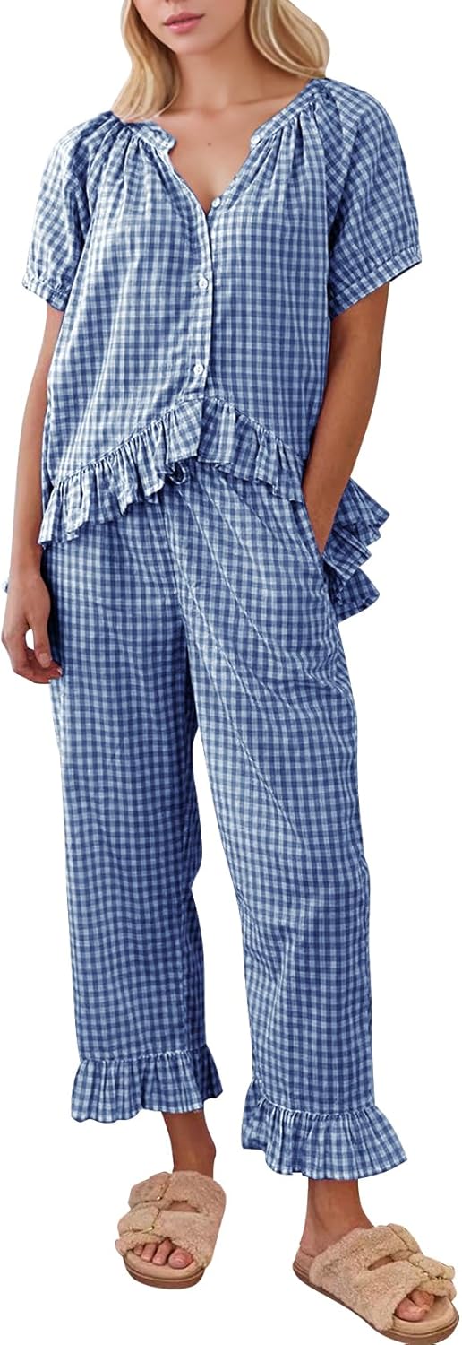 COZYPOIN Womens Gingham Pajama Set 2 Piece Plaid Cotton Pjs Cute Ruffle Sleepwear Maternity Bridesmaid Pajamas Loungewear