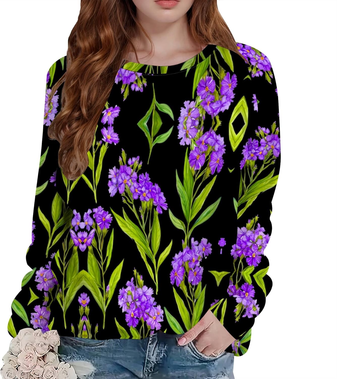 Lavender Print Sweatshirt for Women Plus Size Floral Graphic Pullover Tops Long Sle...