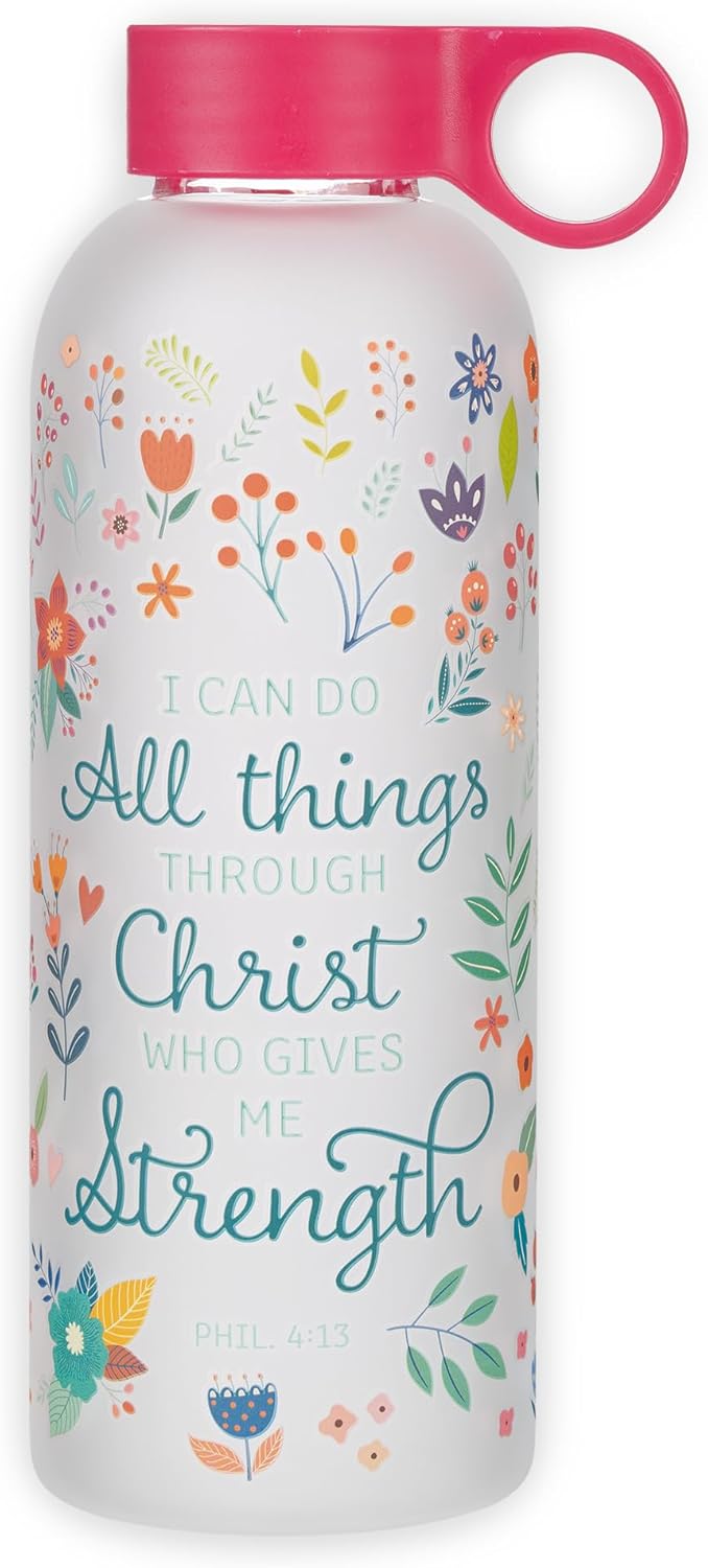 - Beautiful Multicolored Design with an Inspiring, Motivational Message from God's Word: The cute water bottle features the beloved Scripture sentiment "I can do all things through Christ who gives me strength" from Philippians 4:13 on the front printed in a shaded teal multi-font text. Gorgeous, blossoming leafy multicolor florals wrap around the entire bottle with color blends of red, orange, green, pink, blue, yellow, cream & purple. Hand washing is recommended. Not microwave or freezer safe.