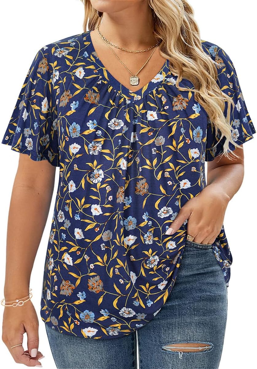 CARCOS Plus Size Tops for Women Short Sleeve Pleated Front Blouse V Neck Tunic Loose Fit Tshirts Summer XL-5XL