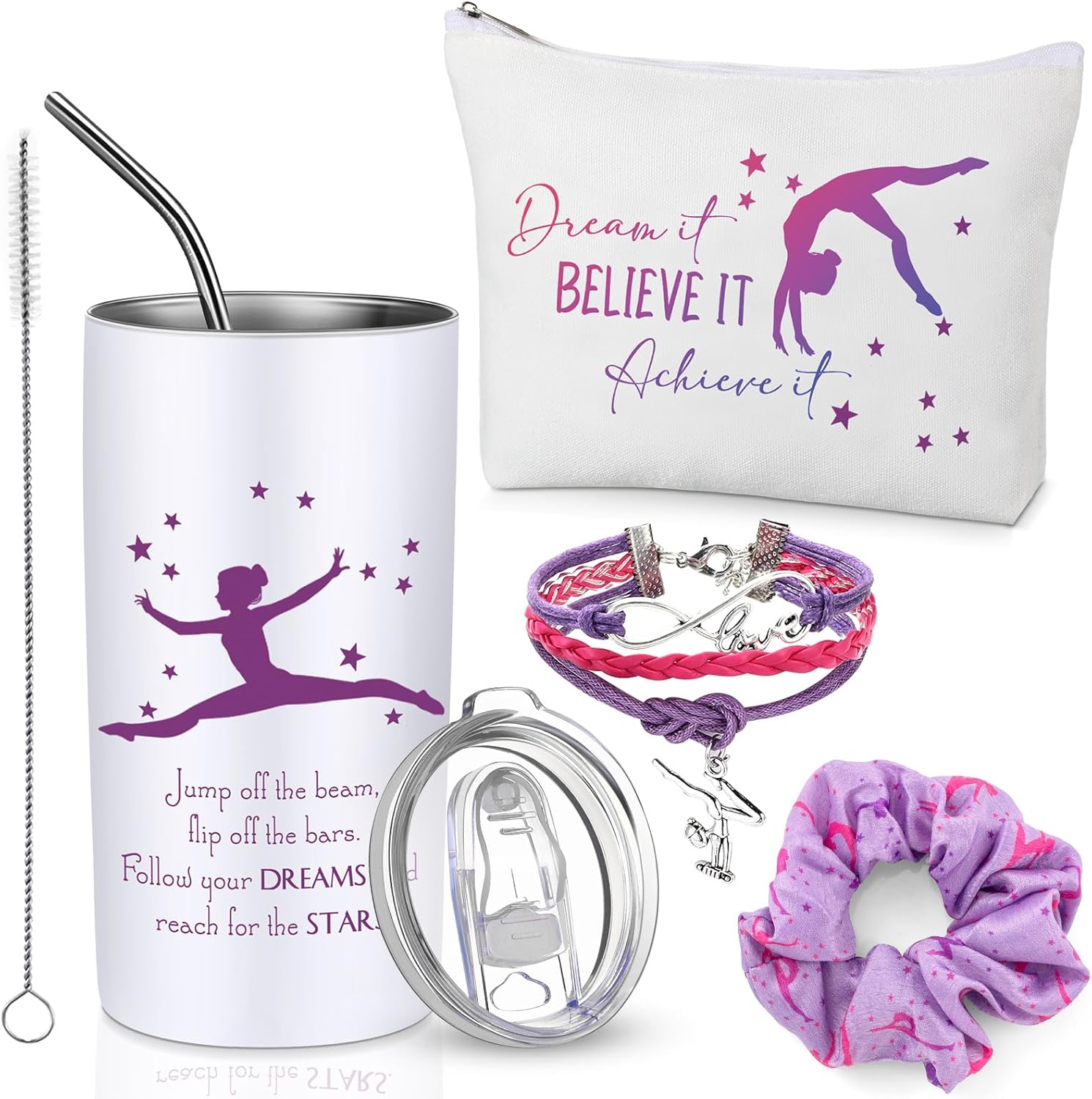 - Nice Combination: this package comes with 4 pieces set of gymnastics gifts, including 1 piece of tumbler cup, 1 piece of scrunchie, 1 piece of makeup bag and 1 piece of bracelet, this combination is nice to meet your daily usage and replacement needs