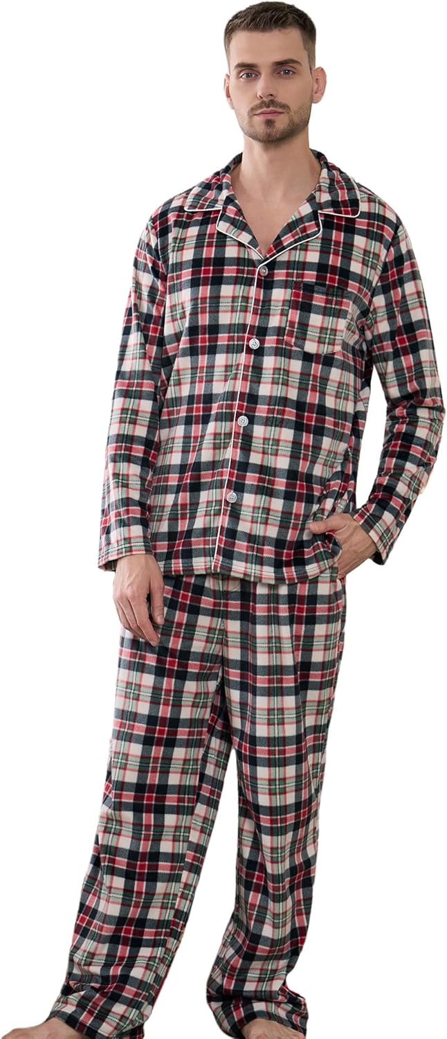 Vulcanodon Mens Pajama Set Soft Button Down Classic Lapel Comfy Long Sleeve Pajamas for Men Lounge Plaid Pjs Set with Pockets