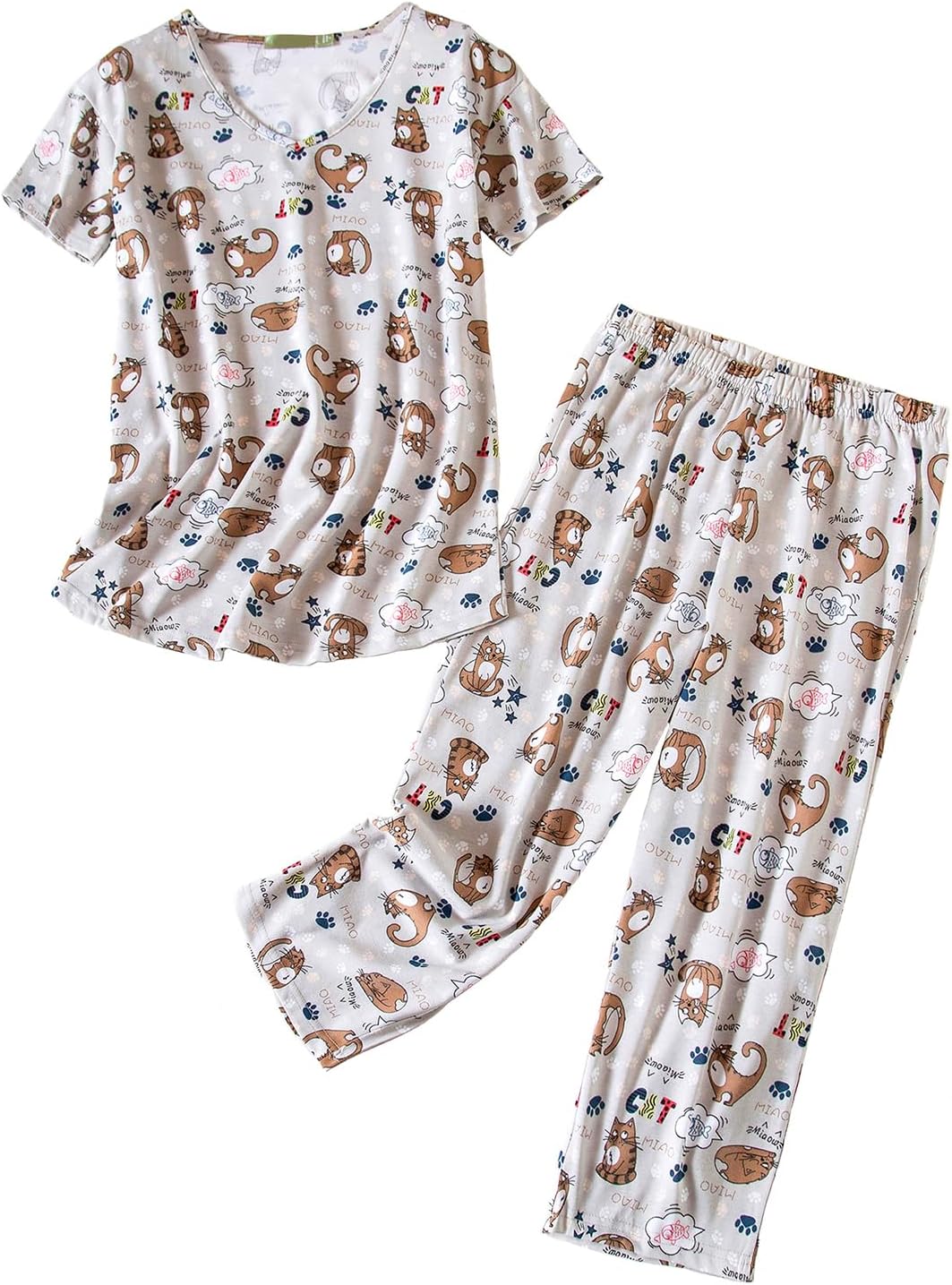 Inadays Womens Cotton Pajama Sets Short Sleeve Top With Capri Pants 2 piece sets for Women Summer Pajamas Lounge Set