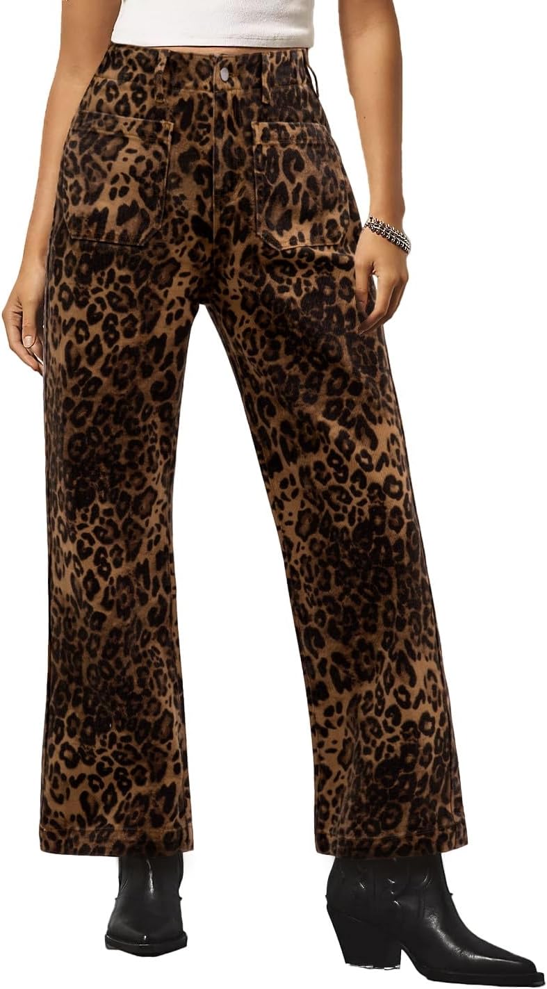 Kedera Women's Leopard Printed Straight Jeans Front Pocket Straight Jeans Casual Boyfriend Ankle Denim Pants
