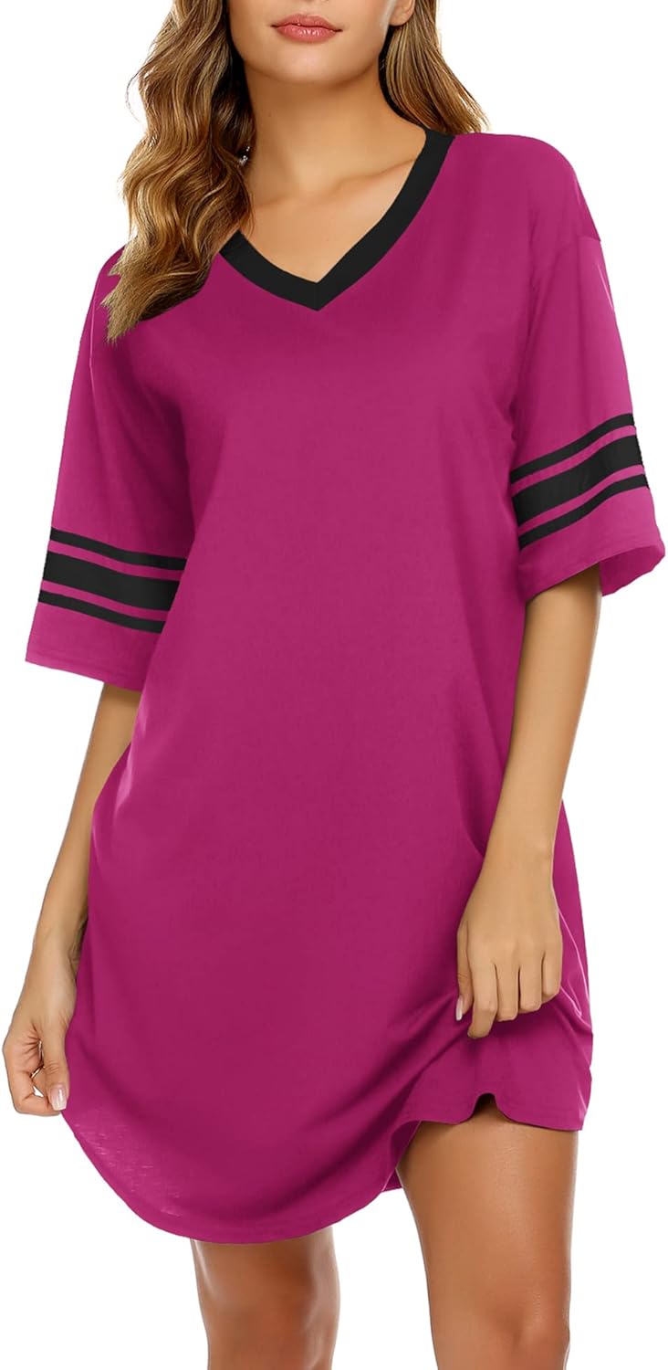 Ekouaer Nightgowns for Women Cotton Night Gown Short Sleeve Sleepwear V Neck Color Block Sleep Shirts Ladies Night Shirts