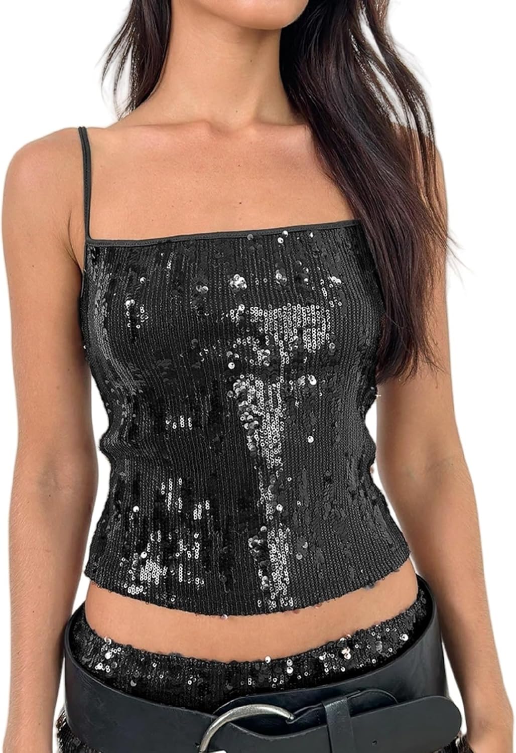 Seyumixi Women Sparkly Cami Top Sequin Spaghetti Strap Glitter Crop Top Sleeveless Going Out Tops Party Concert Outfits