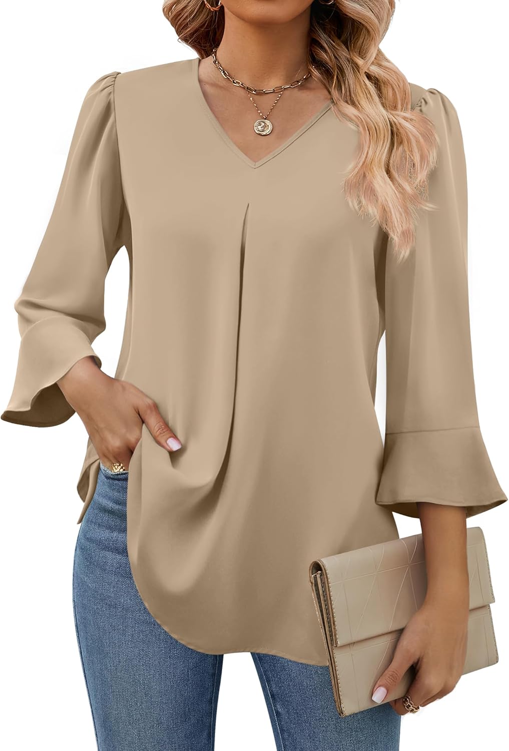 Funlingo 3/4 Sleeve Tops for Women Dressy V Neck Tunic Work Blouses Fall Chiffon 2025 Fashion Office Shirts