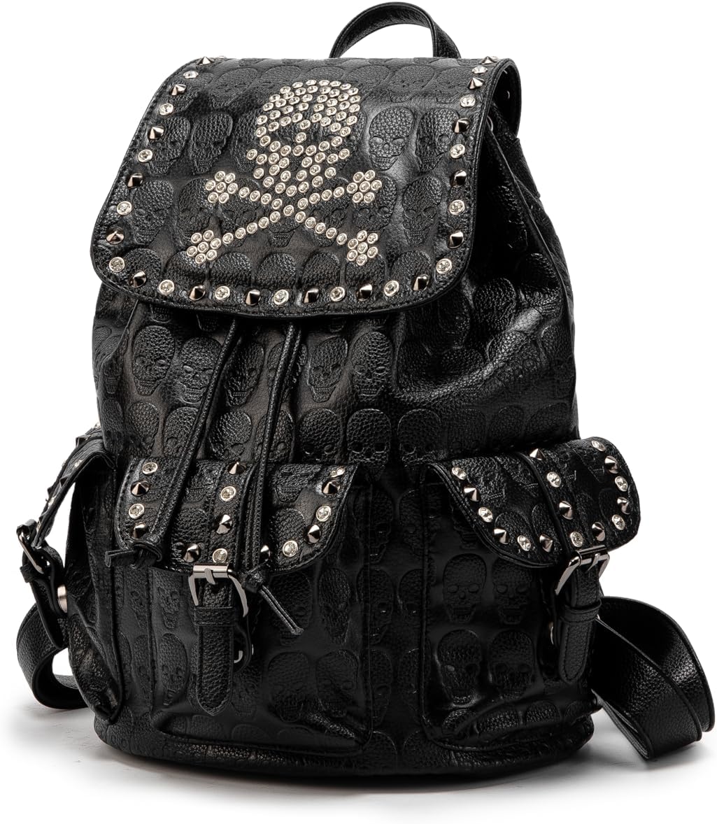 Gothic Skull Studded Backpack for Women & Men, Structured PU Leather Punk Bookbag with Drawstring Flap, A4 & Tablet Friendly Alternative Fashion Design