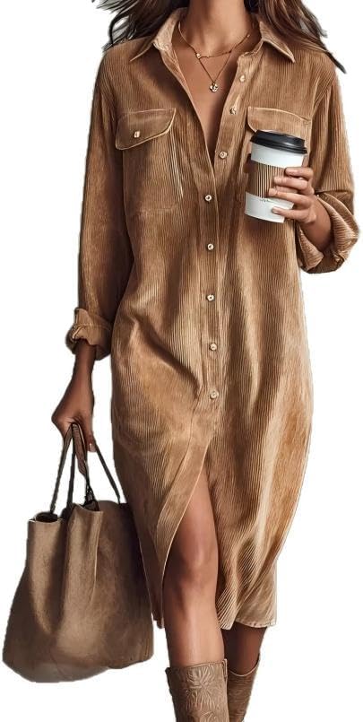 Womens Corduroy Button Down Shirt Dress Lapel Long Sleeve Solid Color Casual Loose Midi Fall Spring Dresses