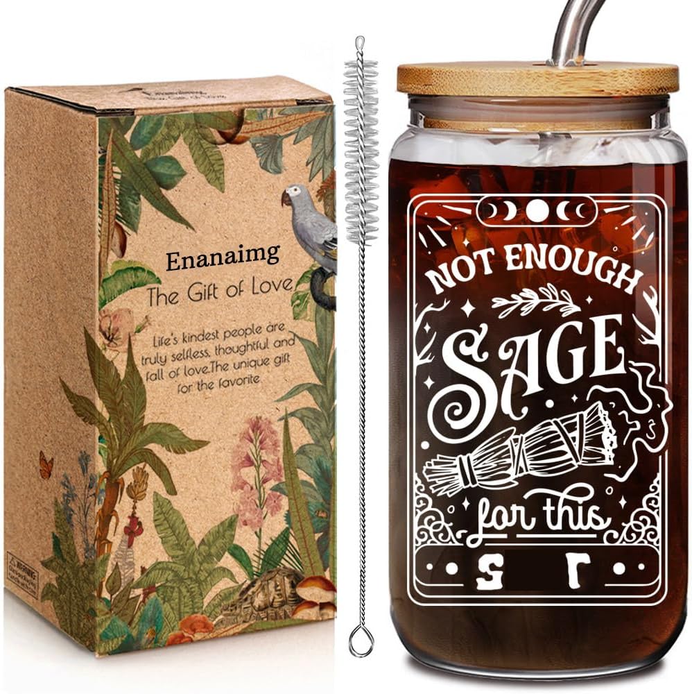 Funny Witchy Tarot Card Skeleton Coffee 16oz Glass Cup Gift for Women Men - Not Enough Sage, Novelty Witchy Witch Witchcraft Birthday Can Glass with Lid and Straw Presents for Friends Coworker Boss