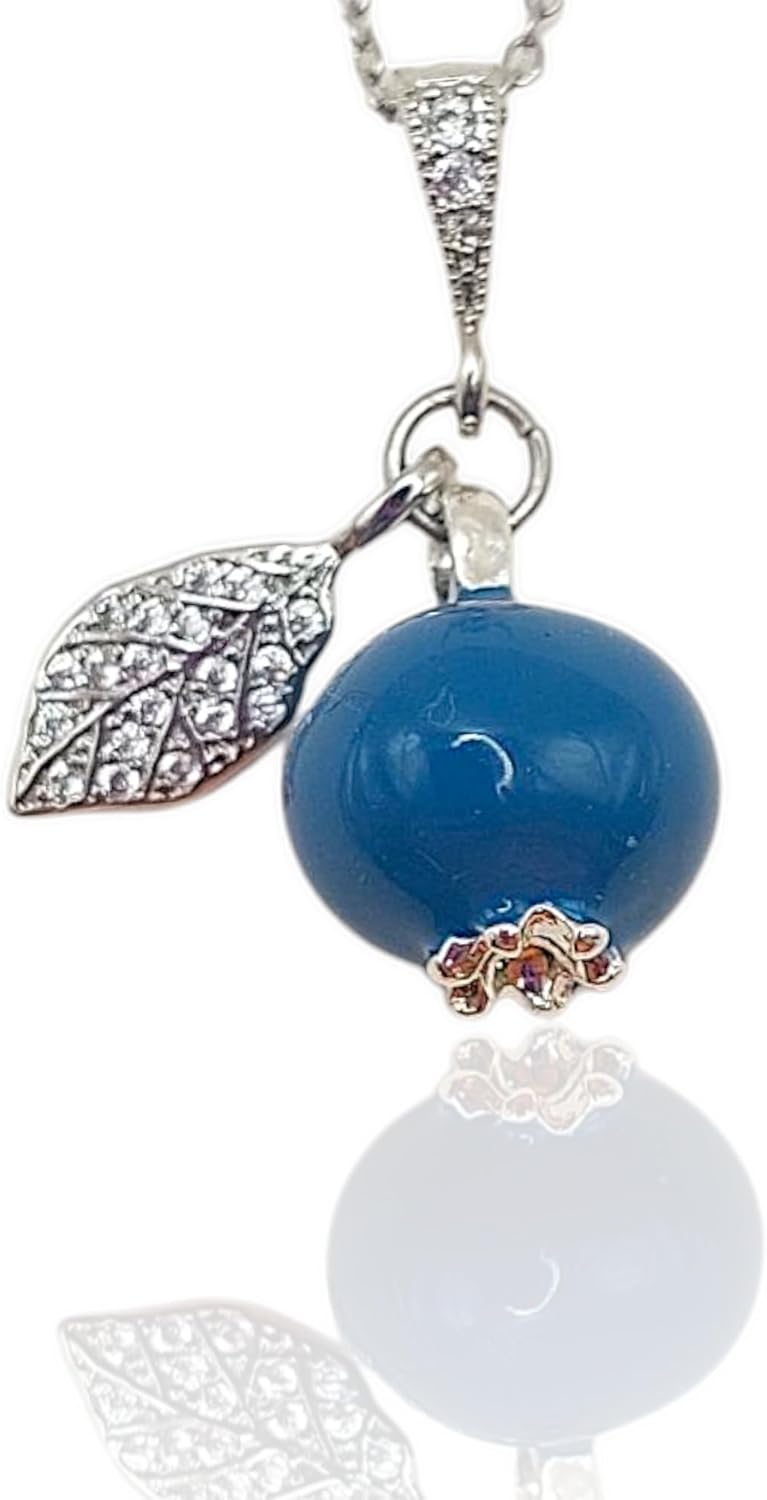 Handmade Enamel Blueberry Pendant Necklace with Crystal Leaf, Silver Chain, Blue