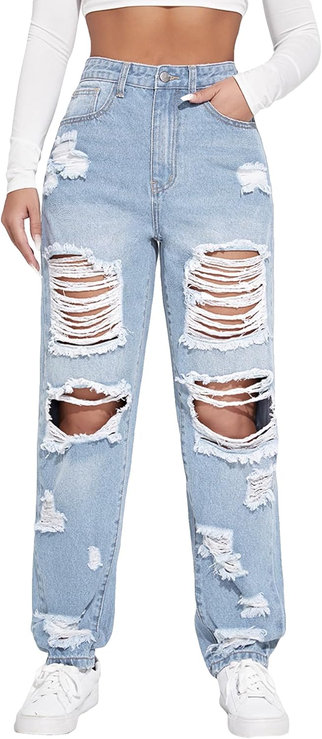 Floerns Women's Ripped High Waist Boyfriend Jeans Distressed Stretchy Denim Pants