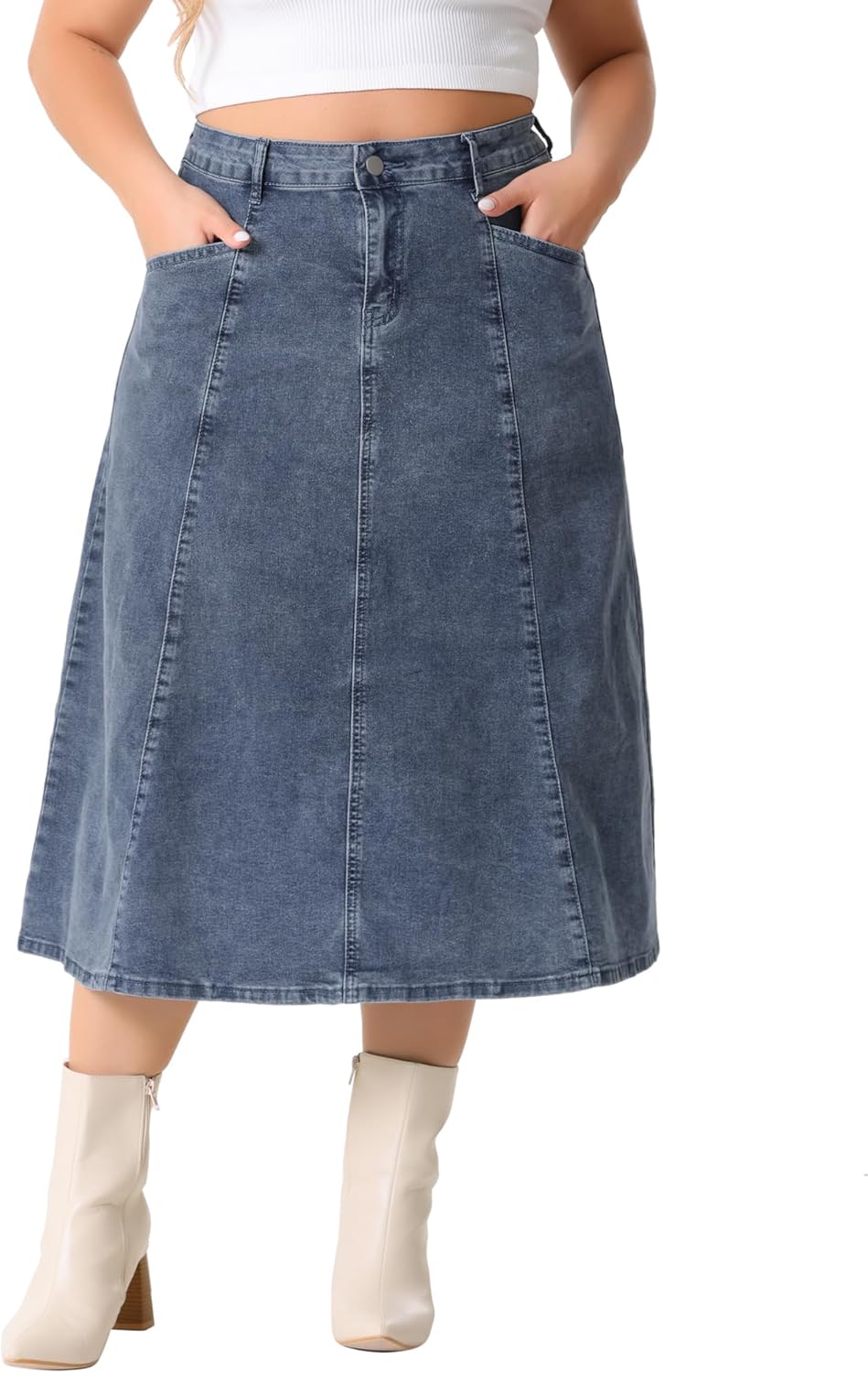 Agnes Orinda Women's Plus Size Denim Skirts Vintage High Waist with Pockets A-Line Midi Jean Skirt