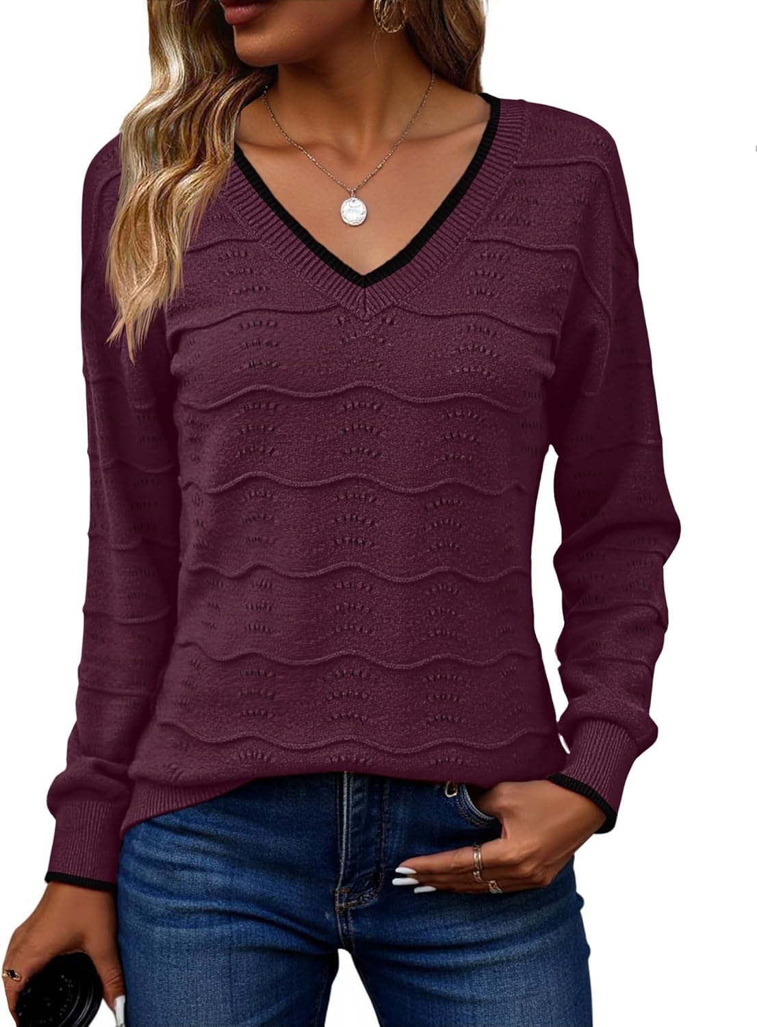 Zeagoo Womens Sweaters Fall Casual Long Sleeve V Neck Shirts Lightweight Crochet Ribbed Knit Pullover Tops Outfits