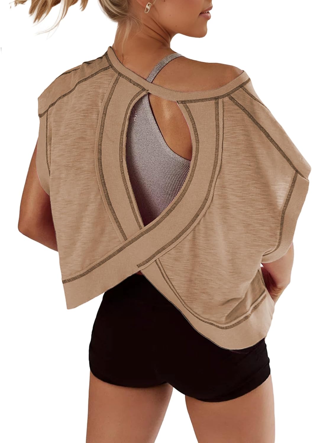 Open Back Tops for Women Oversized Short Sleeve Workout T Shirts Backless Y2k Athletic Crop Running Tees