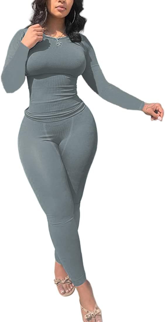 Casual Workout 2 Piece bodycon casual outfit Women Ribbed Set Long Sleeve Elastic Leggings LoungeWear activewear