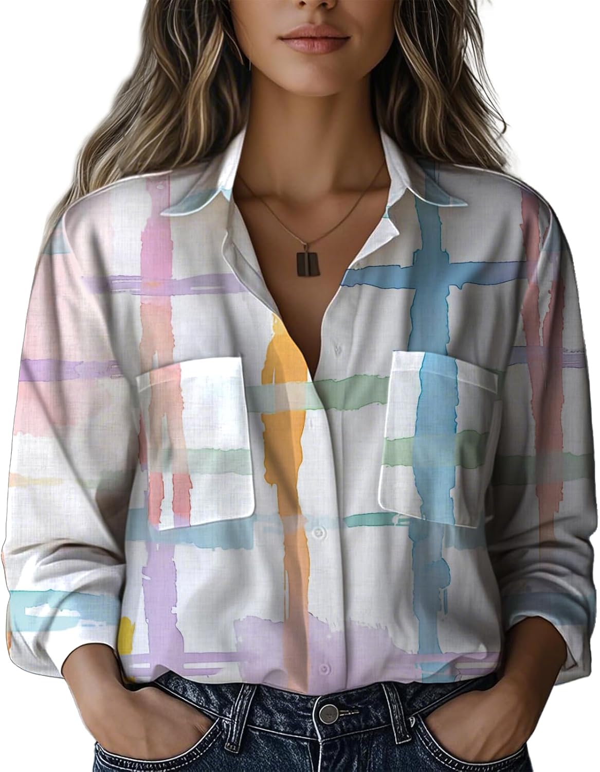 Summer Shirts for Women Casual Baggy Outfit FashionButton Down Long Sleeve Clothes Plus Size Tops with Pocket