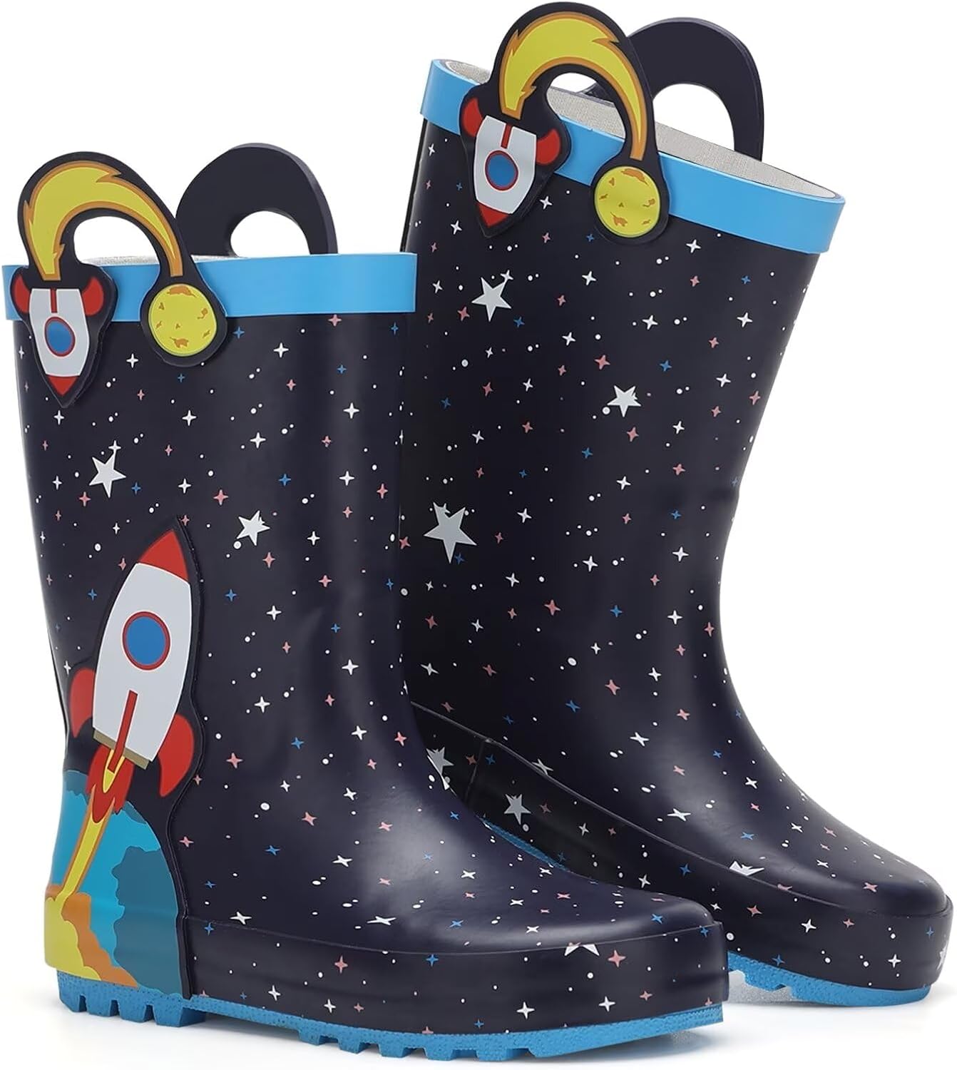 Toddler Rain Boots Kids Waterproof Rubber Boots for Boys and Girls with Handles in Fun Pattern