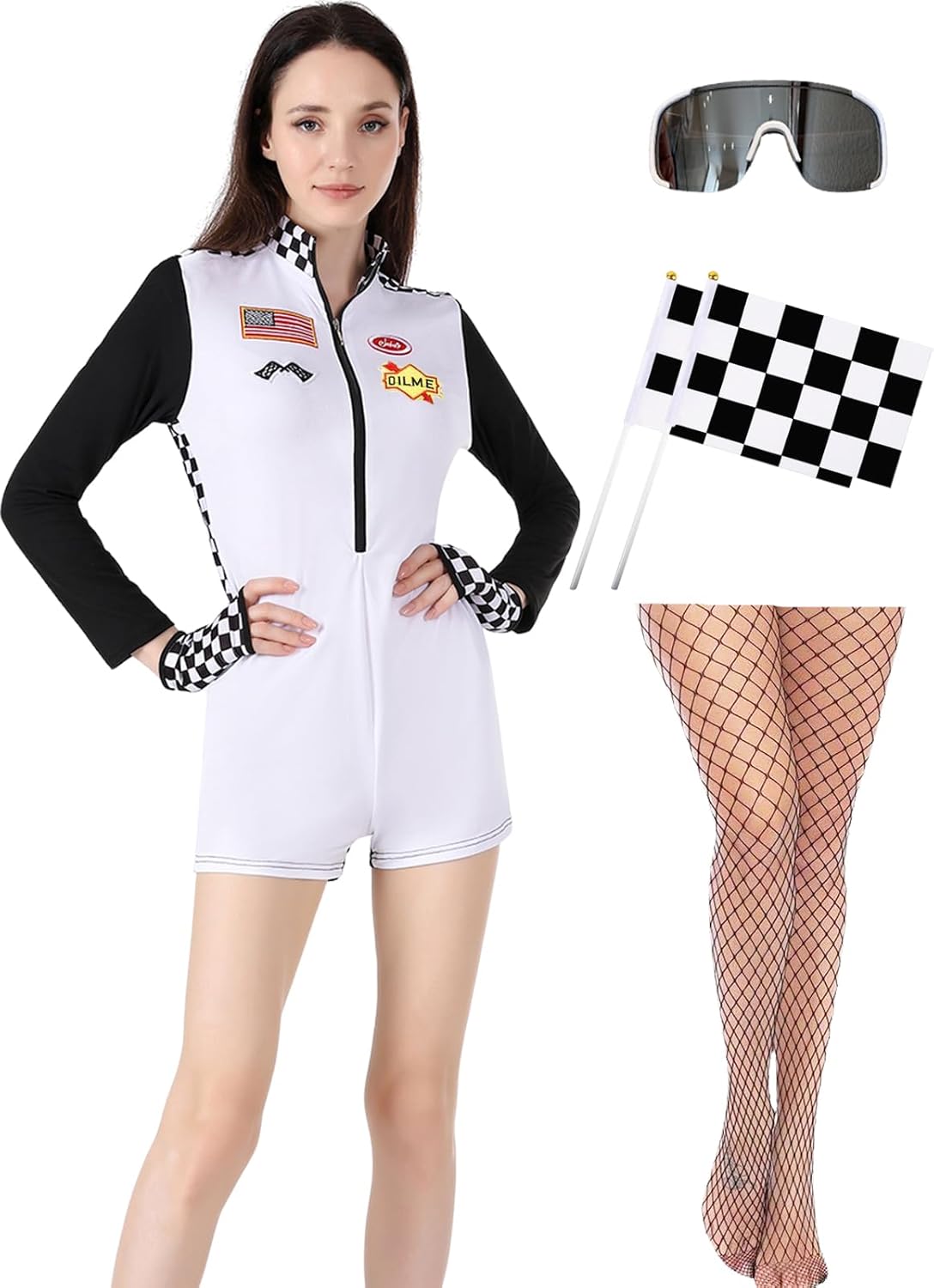 Speed Sexy Race Car Driver Halloween Costume Woman, 6 Pcs Racecar Costume Women Long Sleeves Jumpsuit Outfit