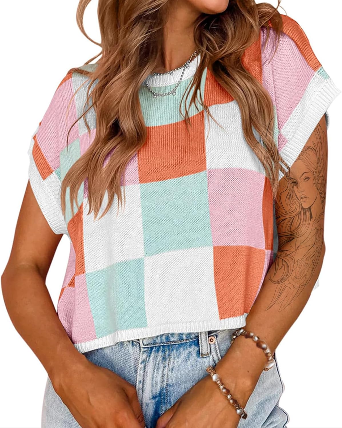 Summer Checkered T Shirts for Women Classic Casual Loose Crewneck Short Sleeve Tops Cotton Comfy Business Blouses