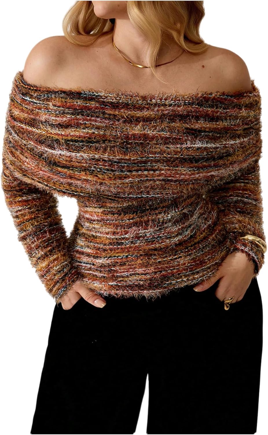 Verdusa Women's Plus Size Fuzzy Striped Off The Shoulder Sweater Foldover Knit Pullovers Holiday Tops