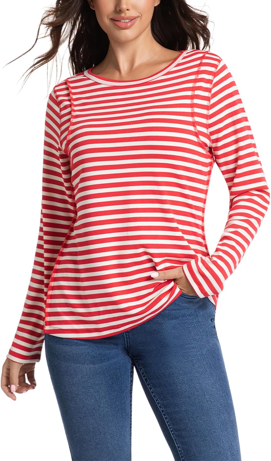 FASHIONSPARK Womens Striped Long Sleeve Shirt Basic Tops Color Block Casual Pullover Tops Exposed Seam Fall Shirts