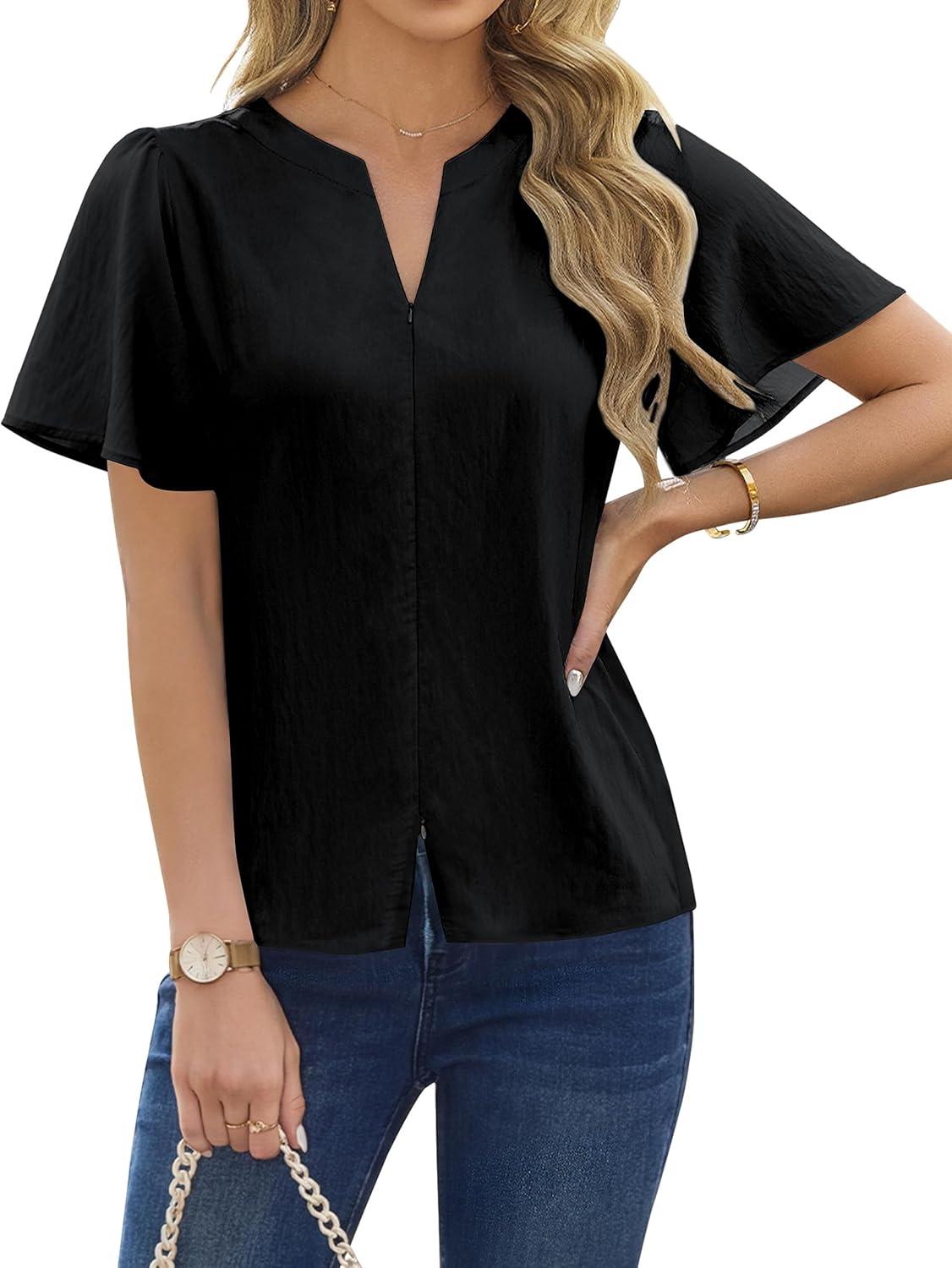 Blooming Jelly Womens Dressy Casual Blouses Business Work Summer Tops Zip Ruffle Short Sleeve Cotton Shirts