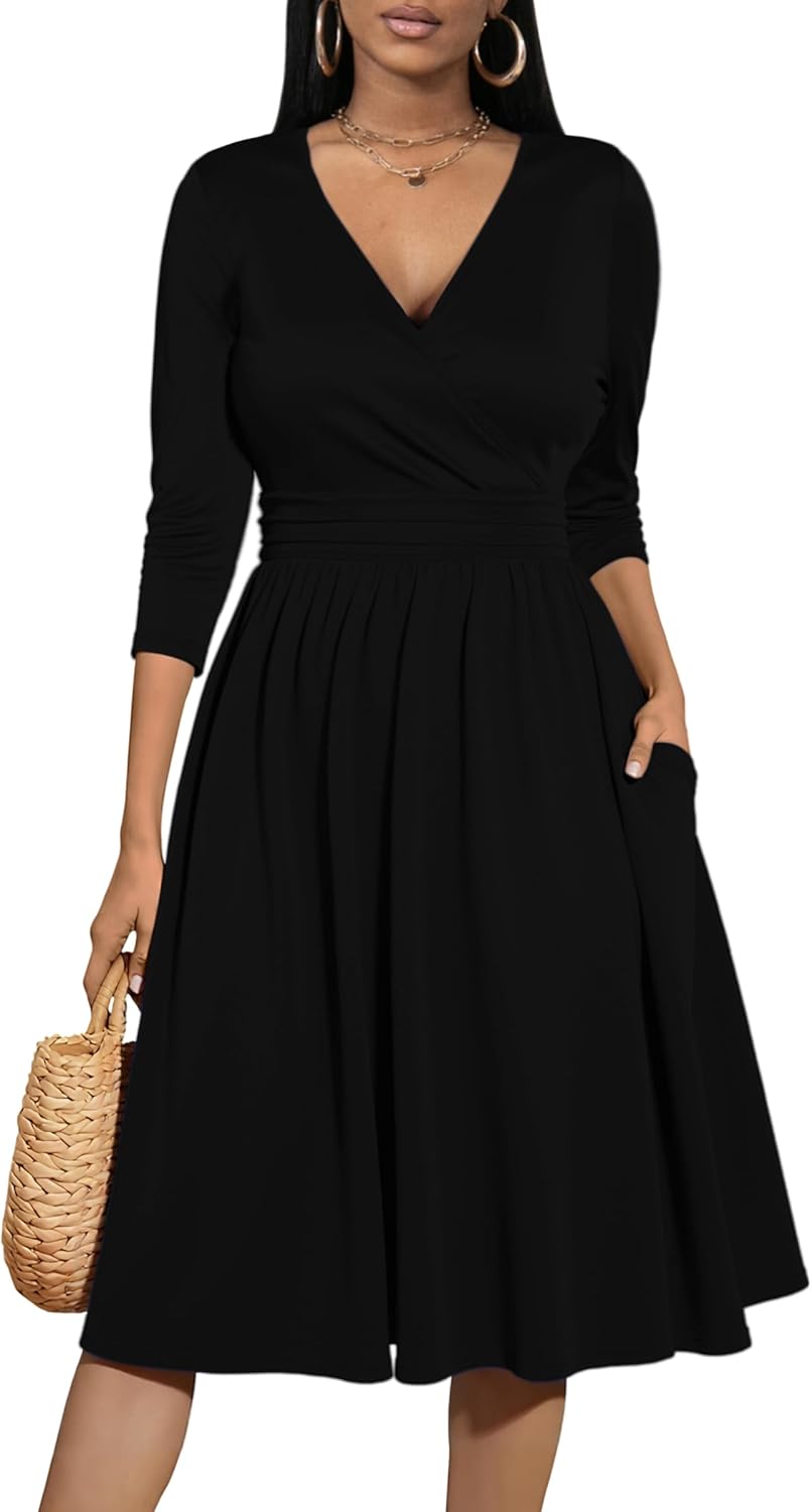Nmoder Wrap Dress Cocktail Casual Dresses for Women Wedding Guest Fit and Flare V Neck 3/4 Sleeve Midi Dress with Pockets Black