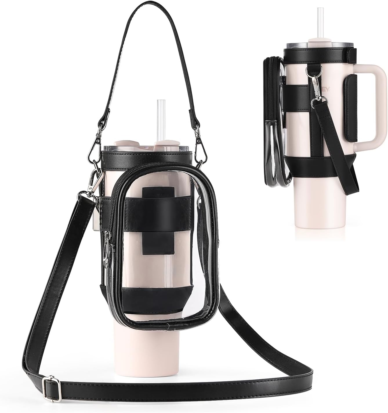 Clear Water Bottle Carrier Bag with Phone Pocket for Stanley Cup 40oz,with Adjustable Shoulder & Handheld Strap Stanley Cup Accessories Edging for Concert Sports (Black)