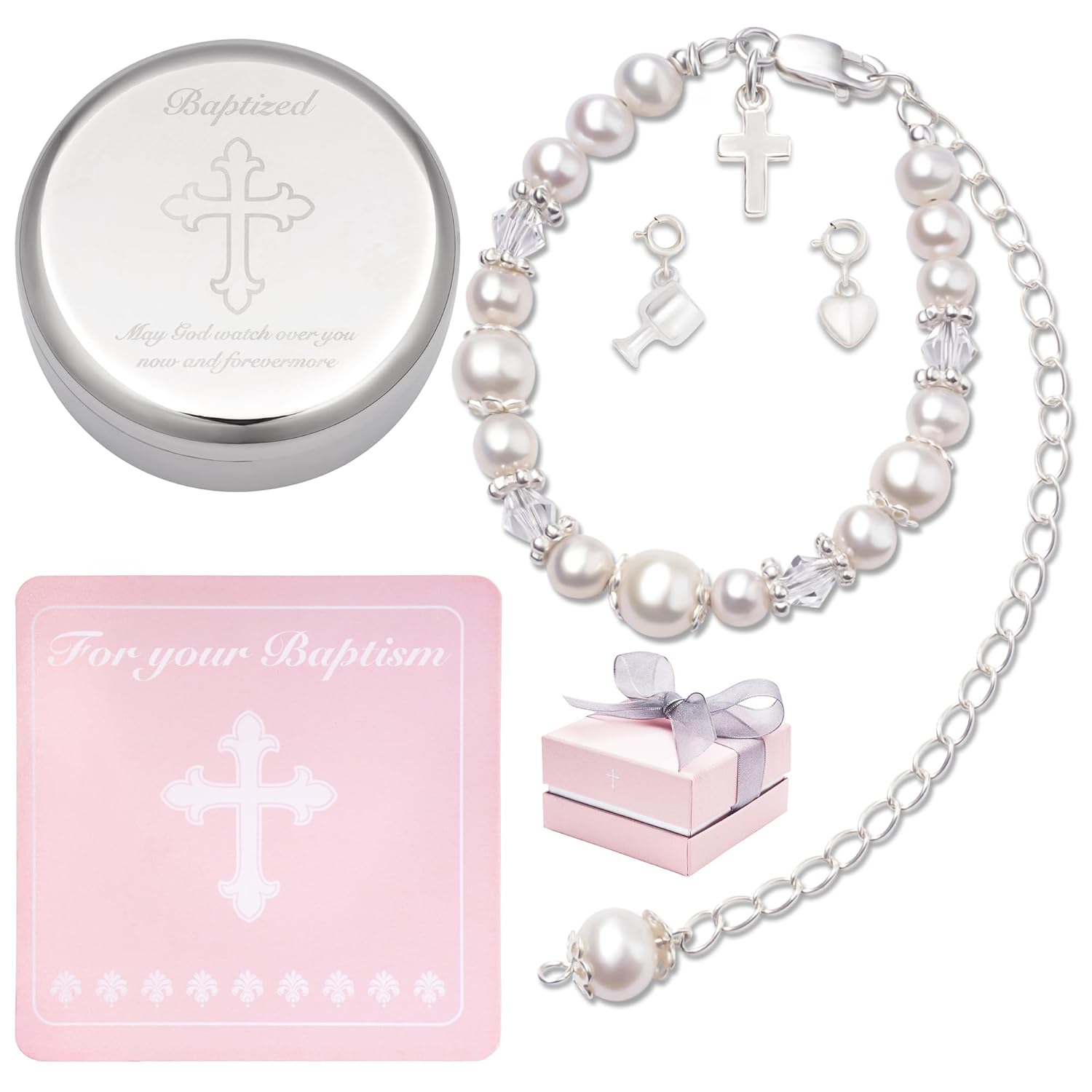 - Unforgettable Baptism Gift - This sterling silver bracelet with cultured pearls has an extender that fits up to a 7.9" wrist. It also comes with a cross engraved classic silver-plated jewelry box as a keepsake for her baptism day.