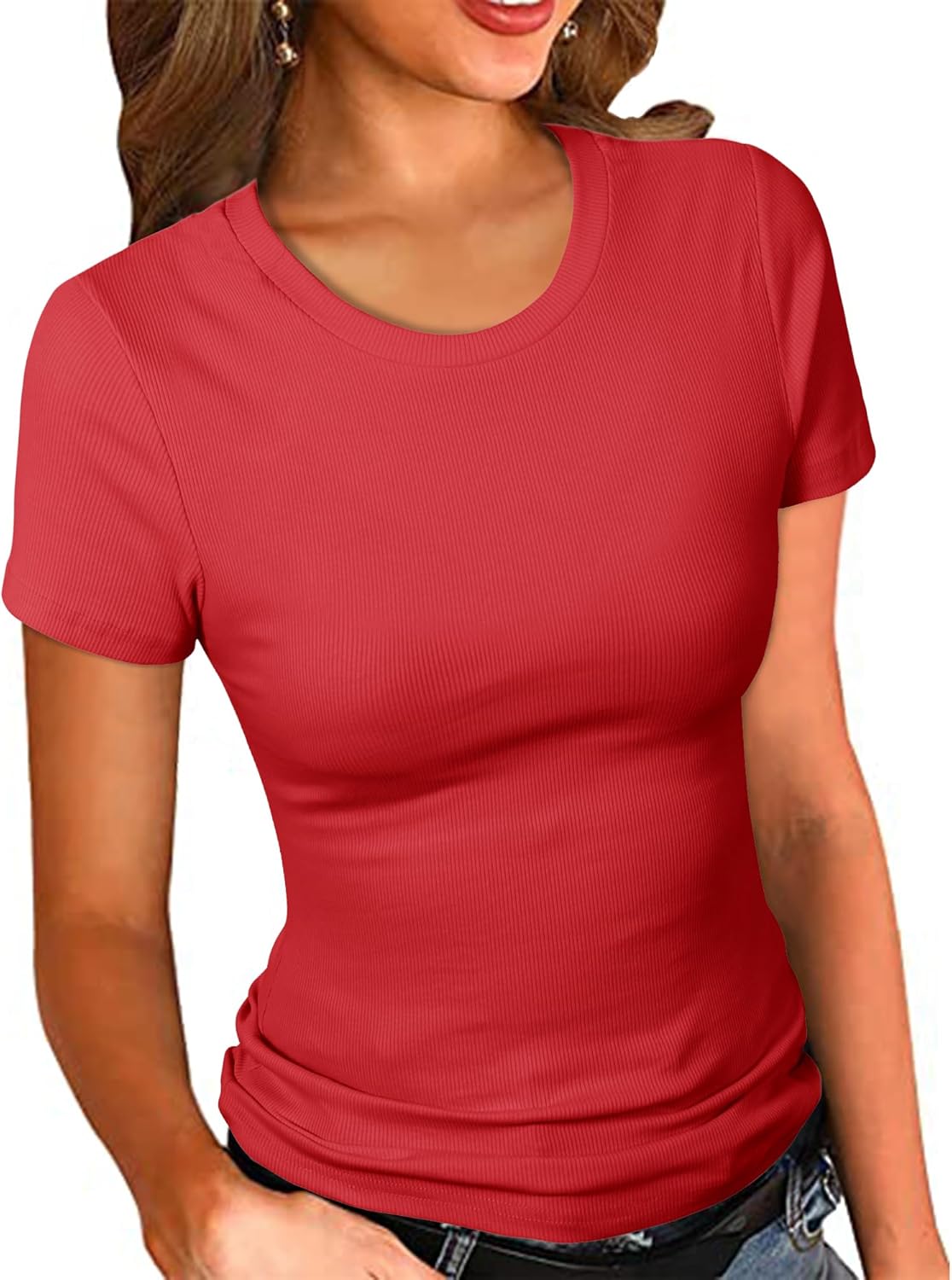 PALINDA Women's Crew Neck Ribbed Fitted Shirt Basic Short Sleeves Summer T Shirt Tops