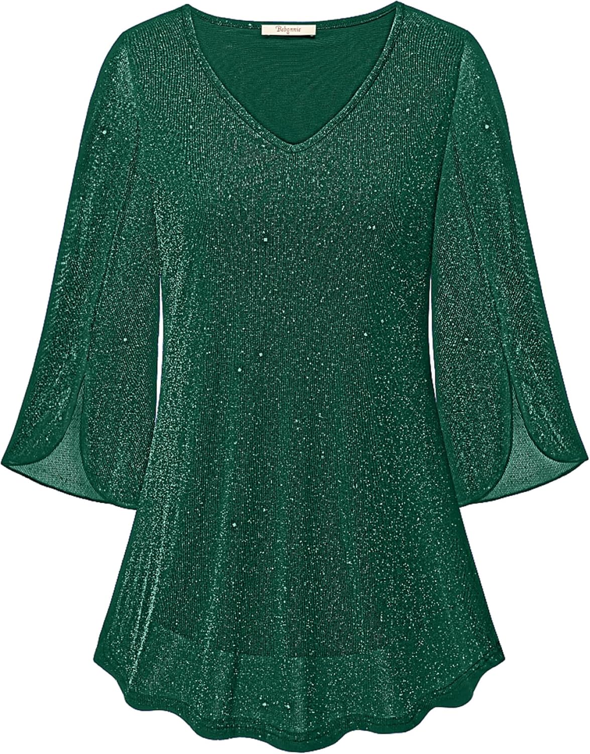 Bebonnie Womens Ruffle 3/4 Sleeve V Neck Double Layers Mesh Blouses Loose Fit Flowy Tunic Tops
