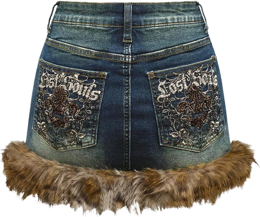 MakeMeChic Women's Mini Denim Skirt Fuzzy Zip Up Y2K Bodycon Jean Skirt with Pocket