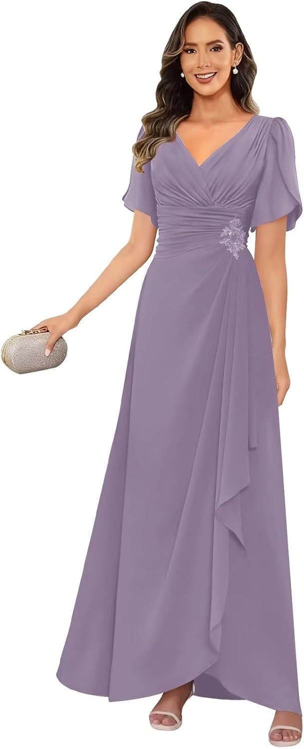 V Neck Mother of The Bride Dresses with Ruffles Short Sleeve Pleated Chiffon Long Formal Dresses for Women
