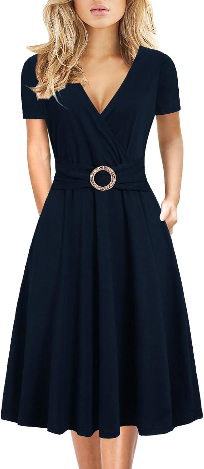 Women's Elegant Criss-Cross V Neck Vintage Short Sleeve Work Casual Fit and Flare Tea Dress with Pockets 980