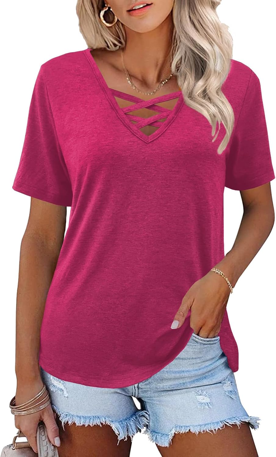 Womens Tops Short Sleeve V Neck Shirts Loose Casual Blouses Summer Tees Criss Cross