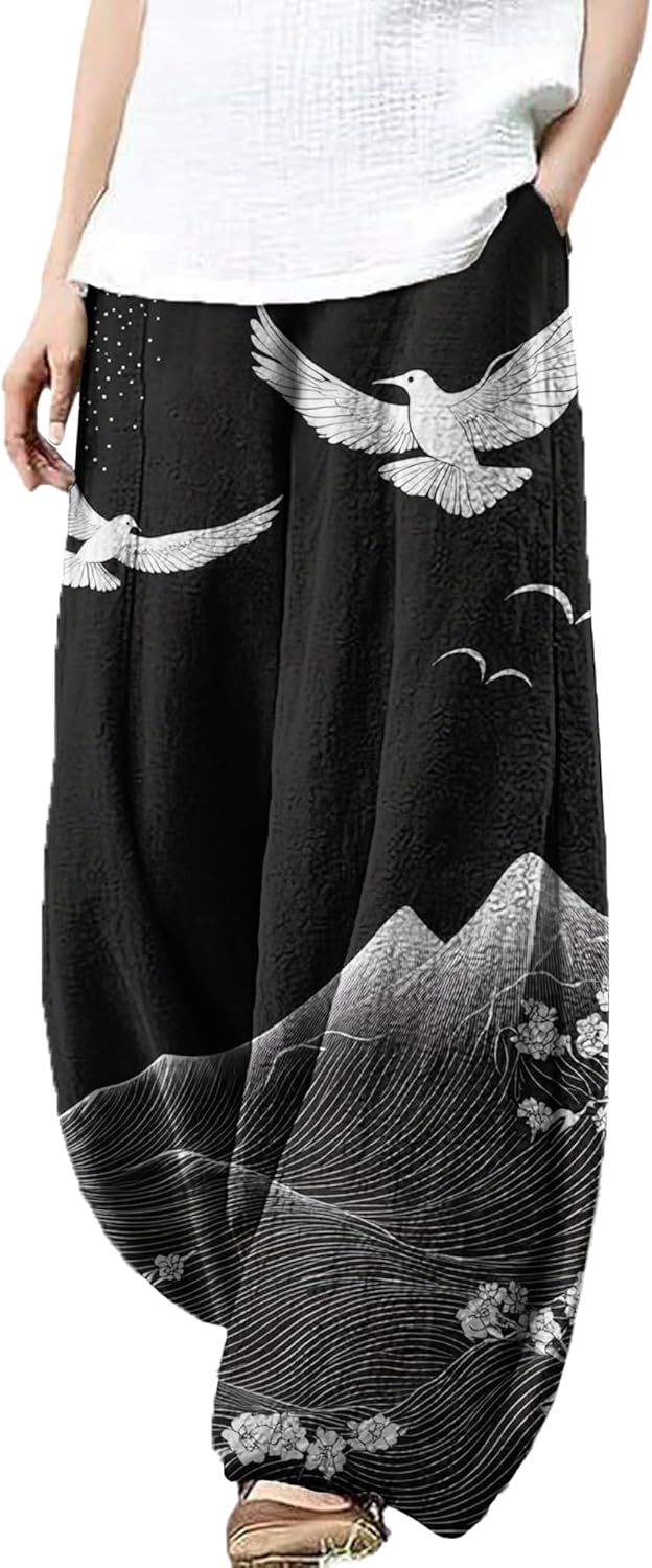 MARSVOVO Wide Leg Pants Woman Lounge Casual Cute Print Harem Pants Plus Size Elastic Travel Palazzo Pants with Pockets