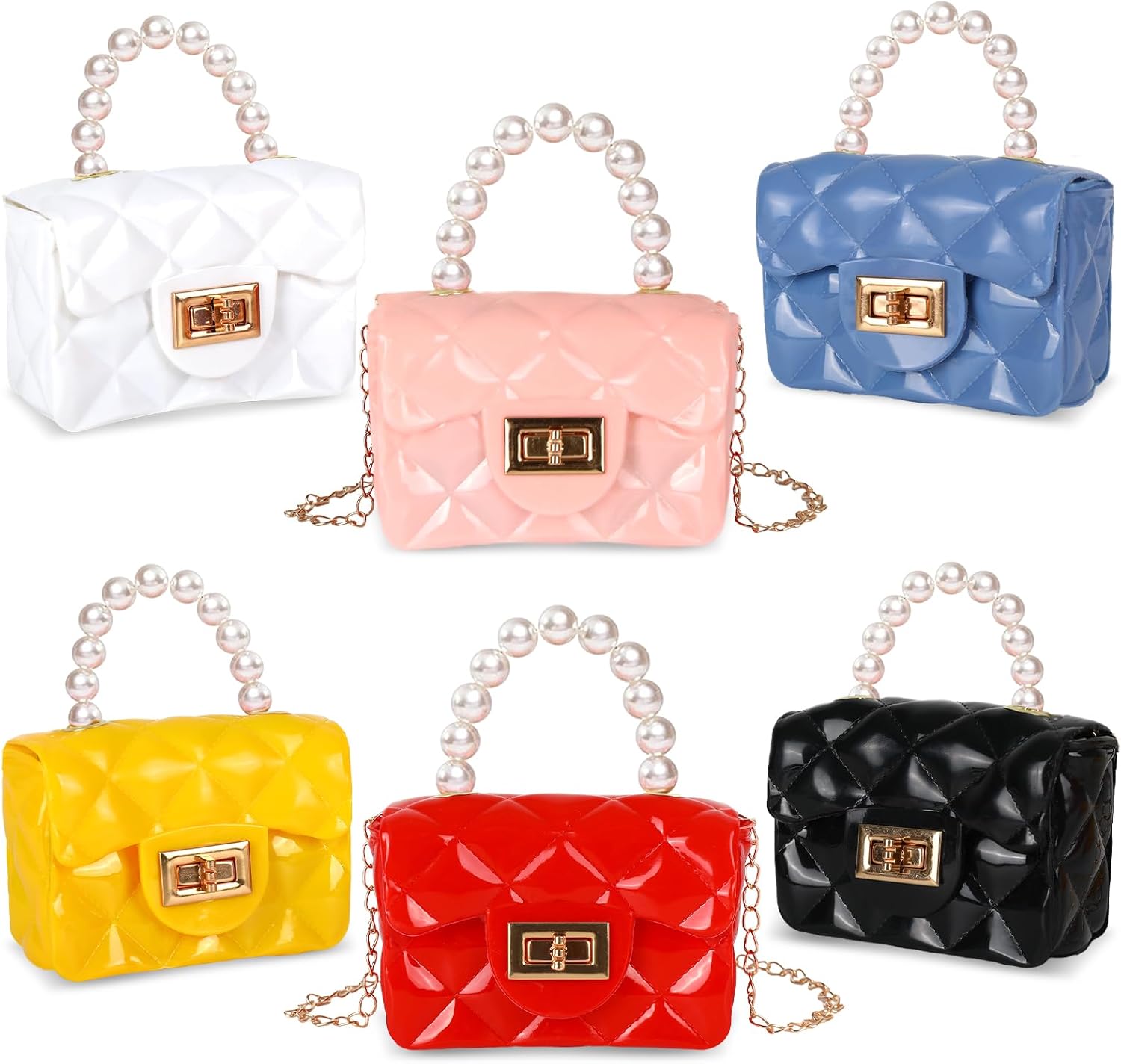 Whaline 6Pcs Mini Purse Small PVC Jelly Crossbody Bag Cute Toddler Princess Handbag with Pearl Handle for Women Girl Bridesmaid Birthday Party Gift Supplies