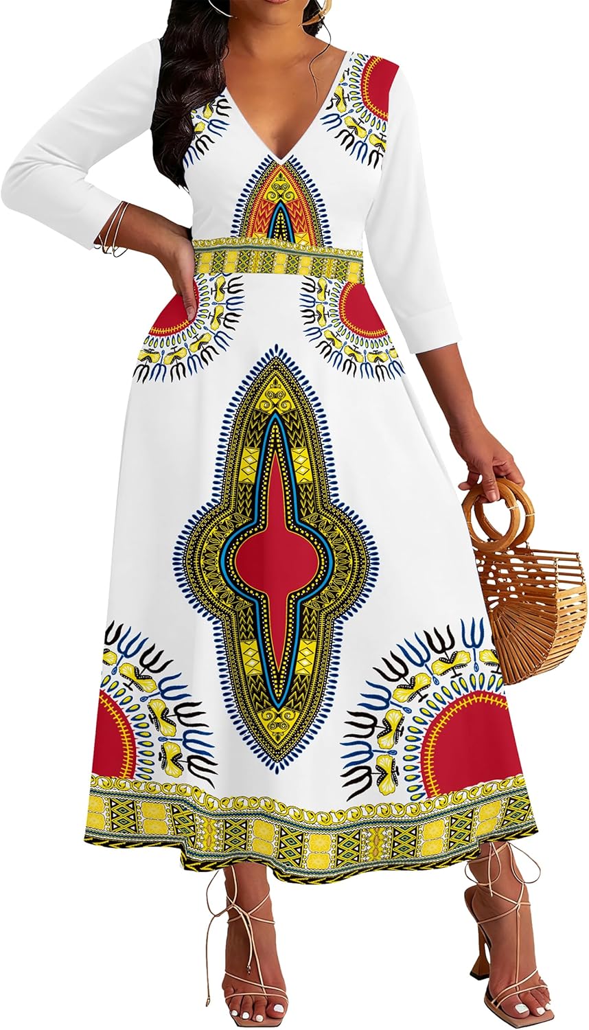 FANDEE Women's Dresses Church Loose Fit V Neck Dress with 3/4 Sleeve and Belt Design Casual Long African Attire Dress