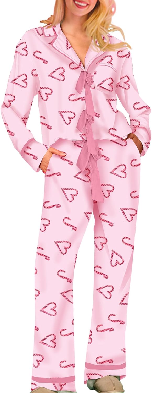 Bow Pajamas Set for Women Cute Bow Tie Long Sleeve Shirt Pants Satin Silk Heart 2 Piece Pjs Set Sleepwear