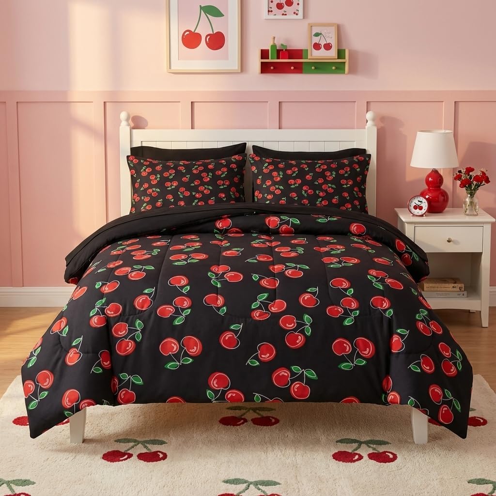 - Cherry Bedroom Decor: The girls bedding set with sheets is suitable for any cute, warm and romantic girl bedroom style. Girls bed set is paired with a pattern of cherries. Cute cherry printed comforter set with sheets will add topics for kids bed time. This cherry-themed bedding makes a heartwarming gift surprise for your girl!