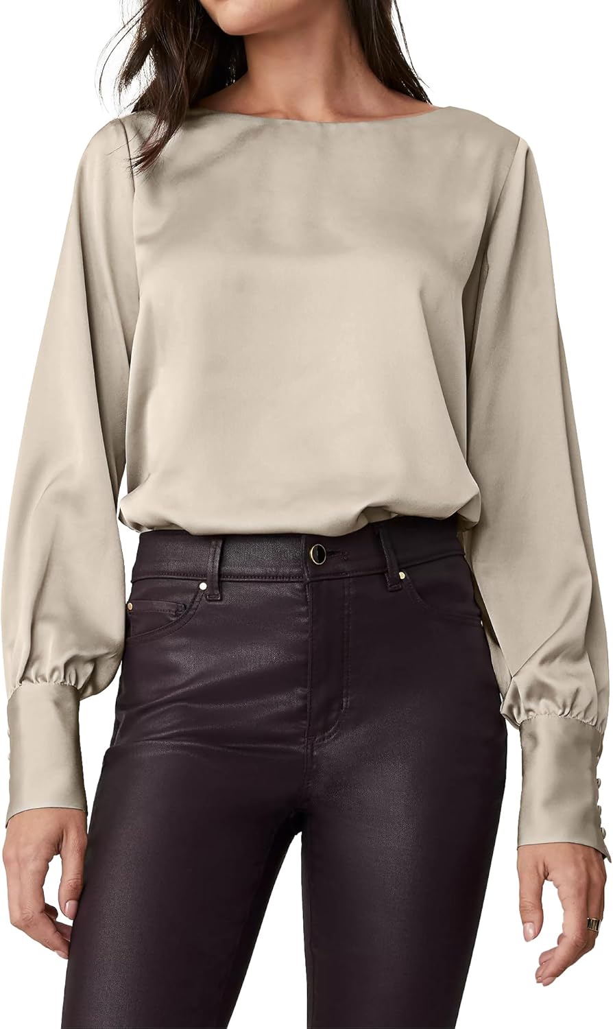 SUNNOW Womens Light Mink Crew Neck Blouse Satin Long Sleeves Top Office Work Business Casual Shirt