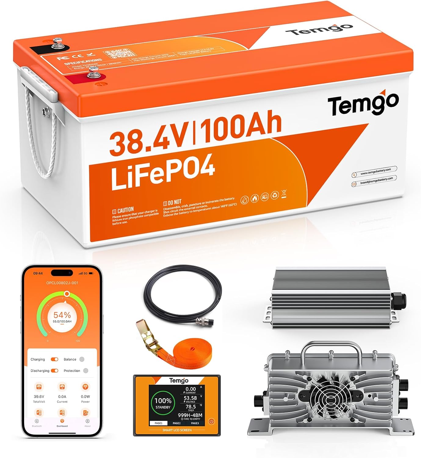 36V (38.4V) 100Ah LiFePO4 Lithium Golf Cart Battery, Built-in 200A BMS, Complete Upgrade Kit with Charger, LCD Display, Voltage Converter, Retention Strap & App, 5000+ Cycles