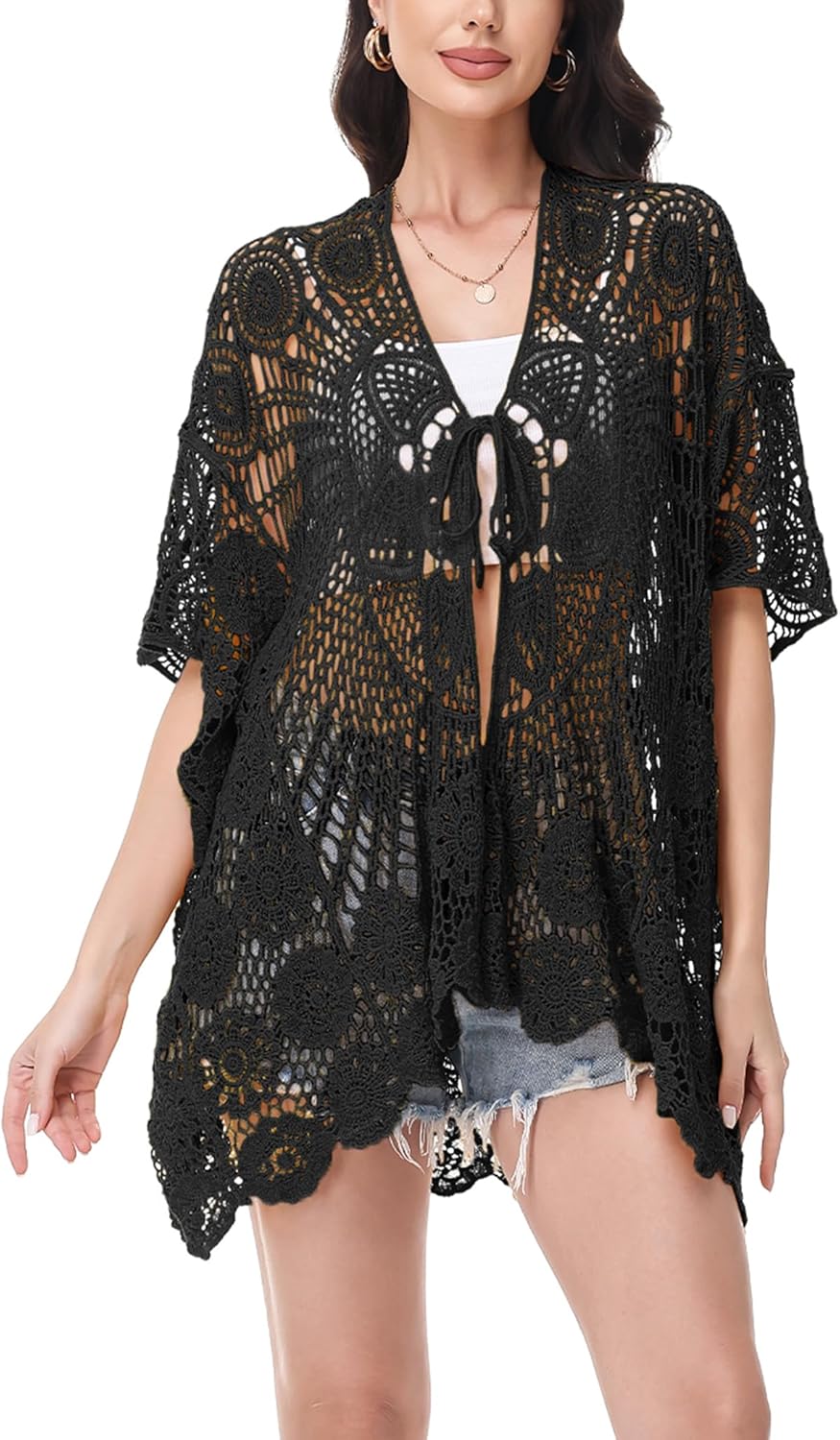 Anna-Kaci Crochet Lace Cardigan Kimono Top with Boho Floral Patterns for Beach, Vacation, or Casual Layering