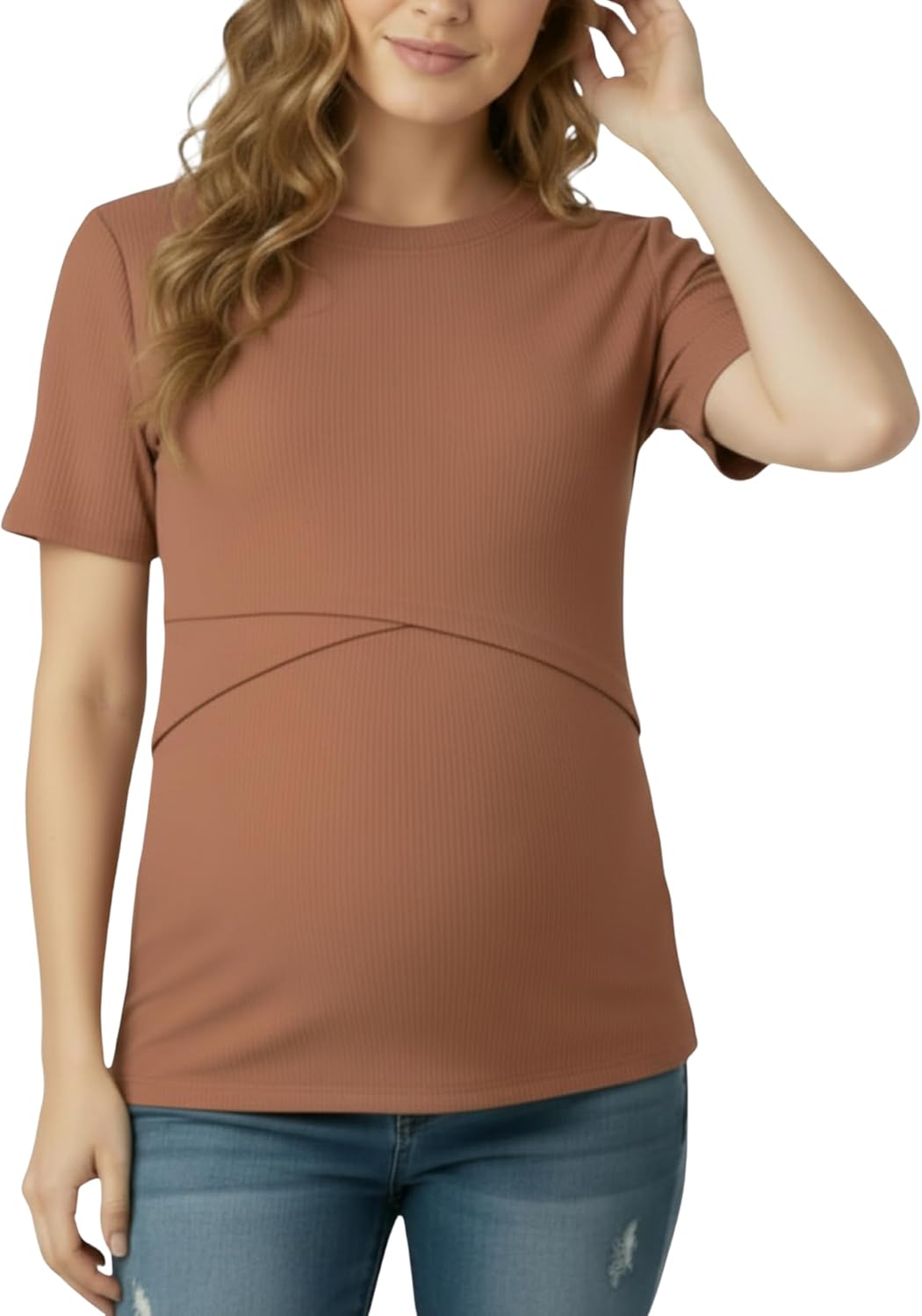 Motherhood Maternity Womens Short Sleeve Crew Neck Cross-Over Nursing Tee Shirt for Breastfeeding with Easy Access