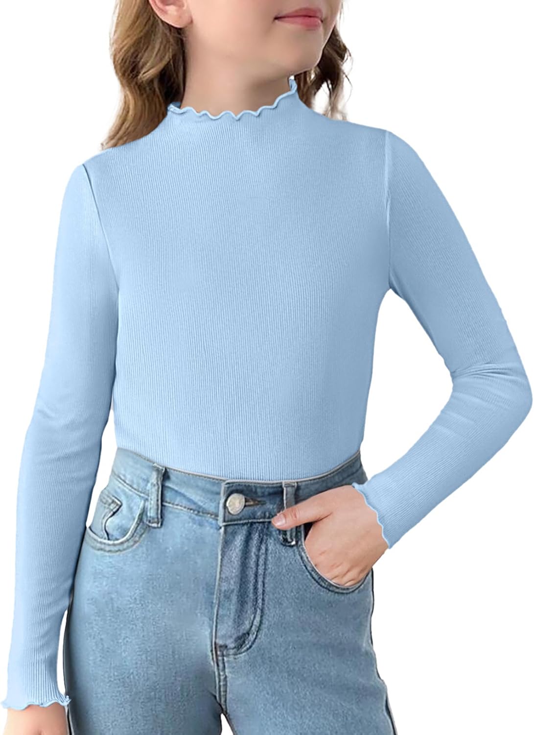 Arshiner Girls Lettuce Trim Mock Neck Long Sleeve Shirts Ribbed Knit Slim Fit Base Layer Tops Tees