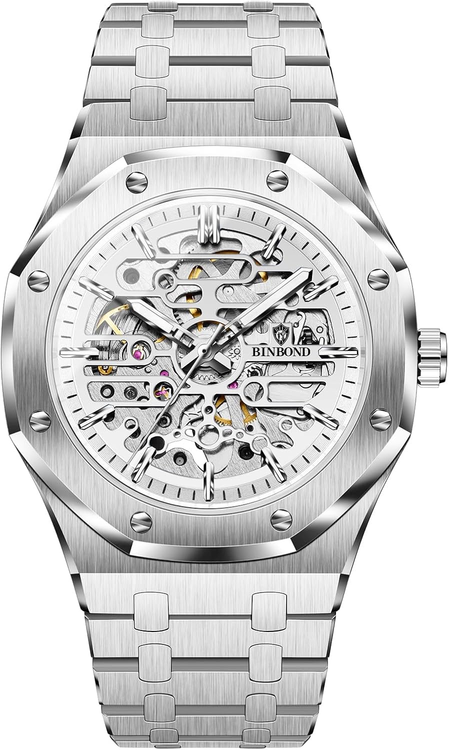 Men's Automatic Watch Skeleton Dial, 43mm Luminous Hands, Stainless Steel Bracelet, 30M Water Resistant Mechanical Wristwatch for Men