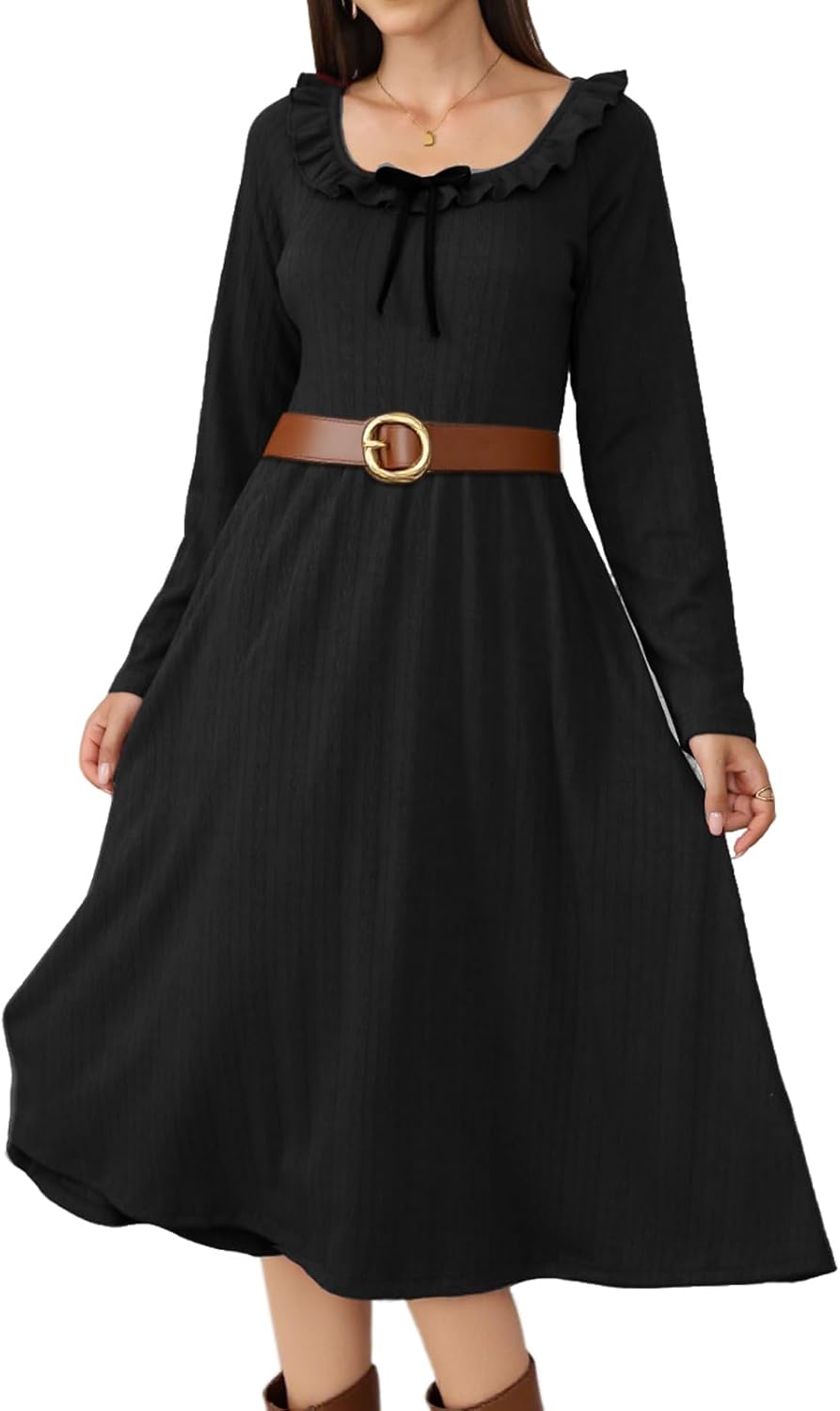 Jayscreate Women's 2025 Knit Ruffle A-line Work Dress Pockets Fall Spring Elasticized Empire Waisted Long Vintage Dress