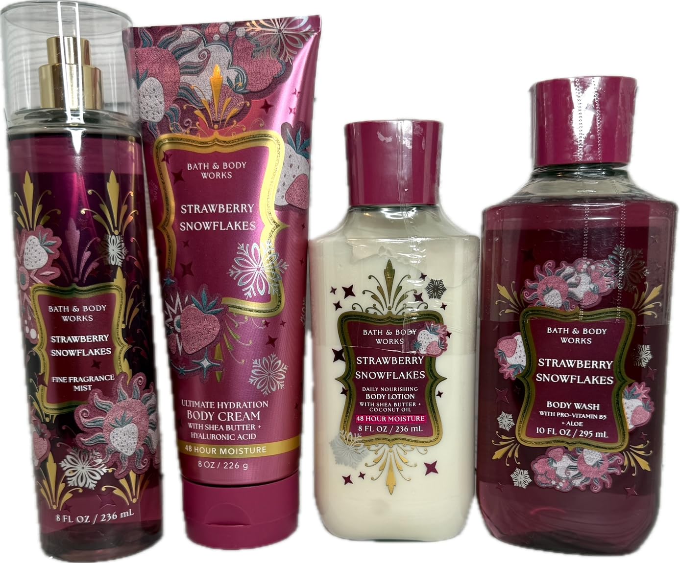 Bath & Body Works Strawberry Snowflakes Gel Wash, Lotion, Ultimate Hydration Cream, and Mist 4 Piece Set